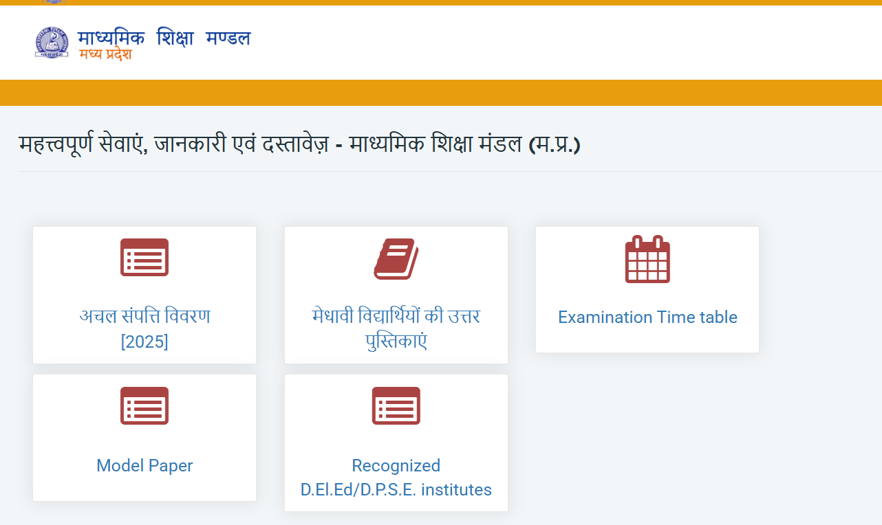 | बोर्ड का नाम | मध्य प्रदेश माध्यमिक शिक्षा परिषद् एमपी बोर्ड |
