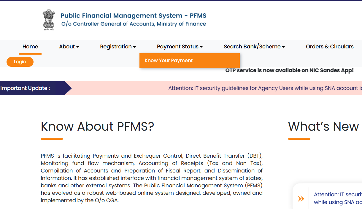 - फर्स्ट स्टेप – सबसे पहले ऑफिसियल वेबसाइट pfms.nic.in पर विजिट करे।